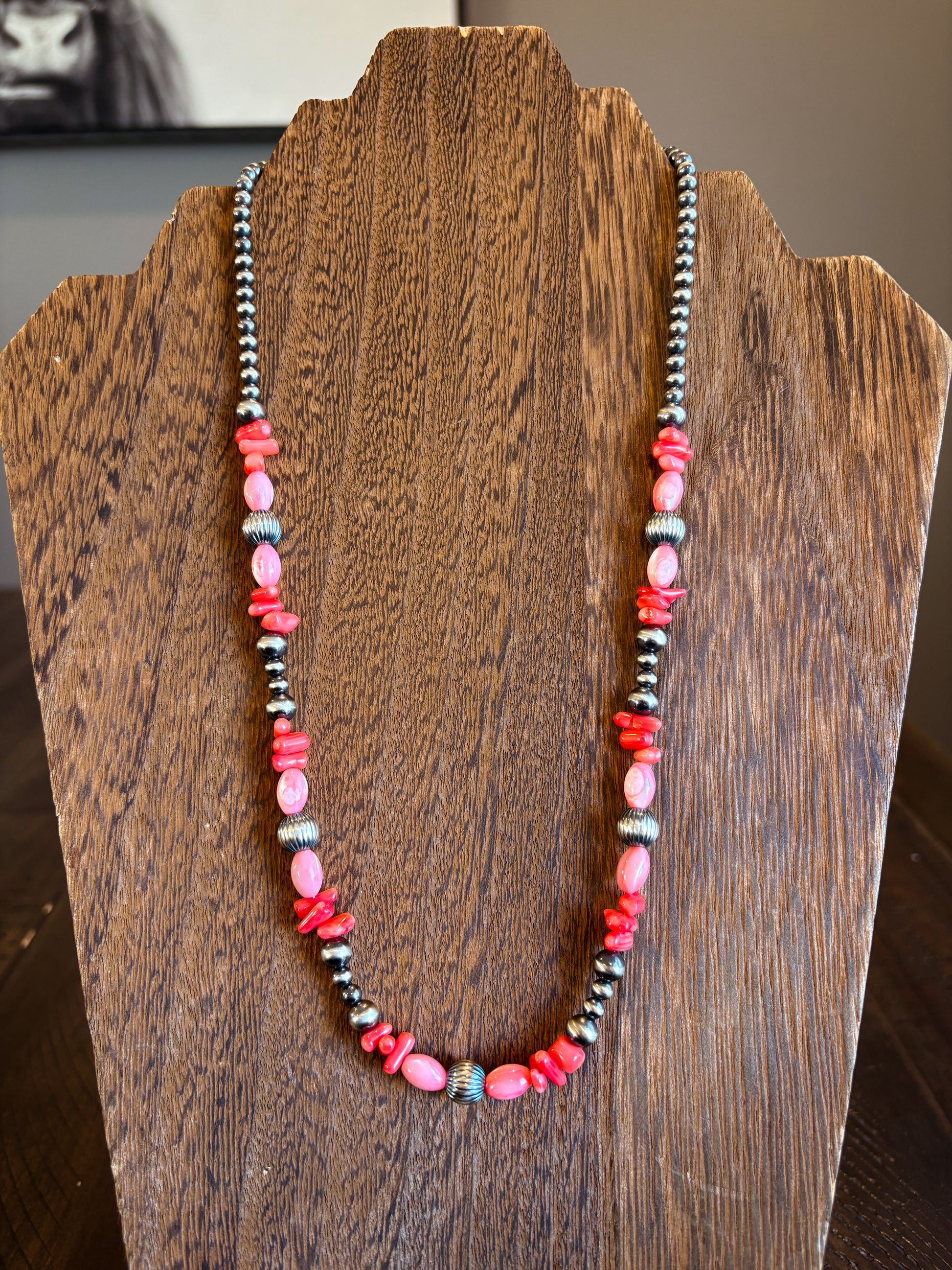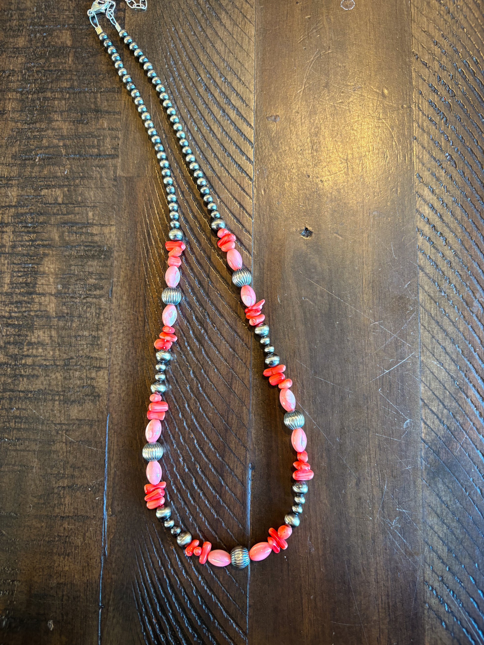 Features 4/6mm pearls, 8mm corrugated pearls, pink mother of pearl, and red coral