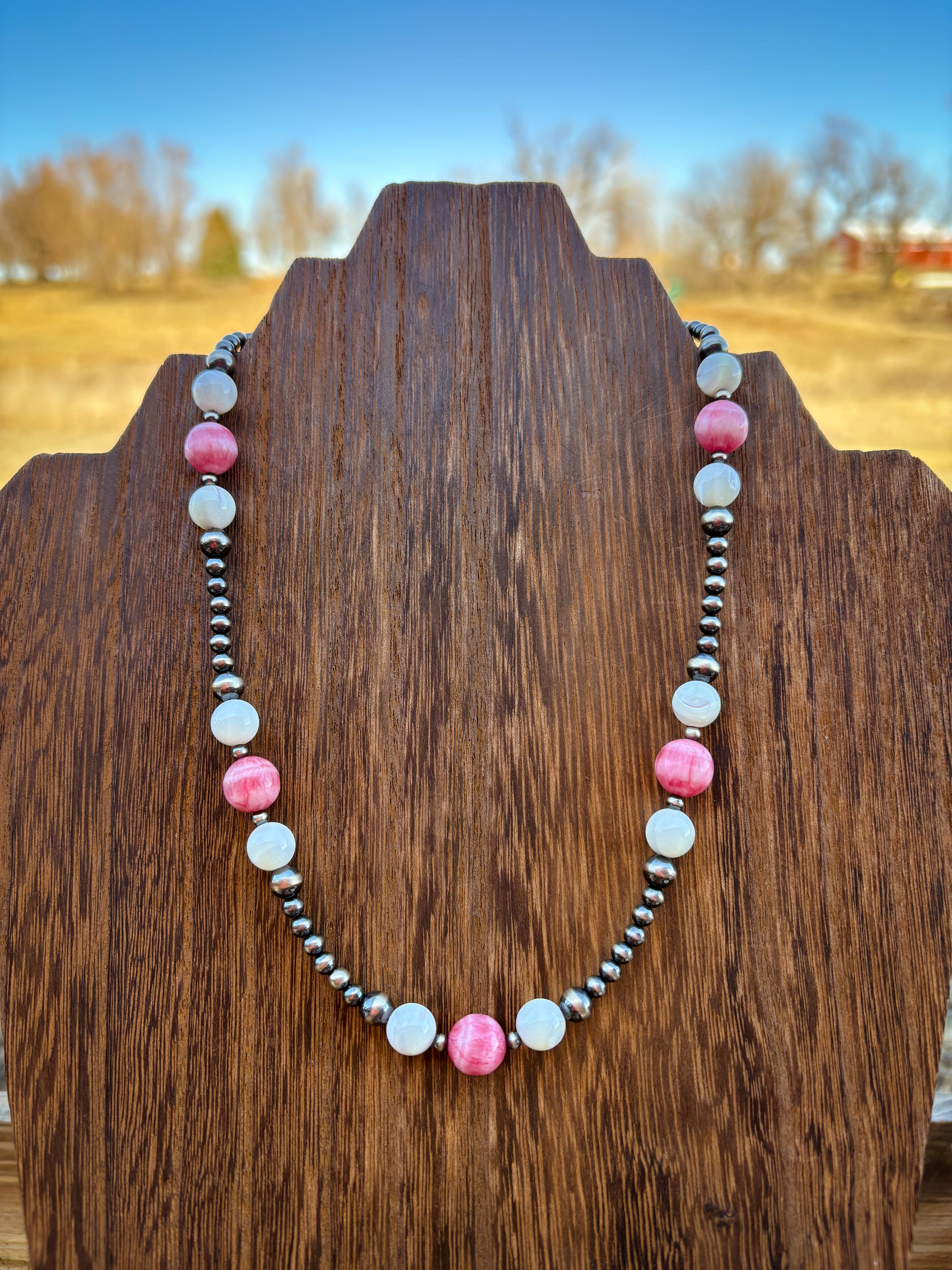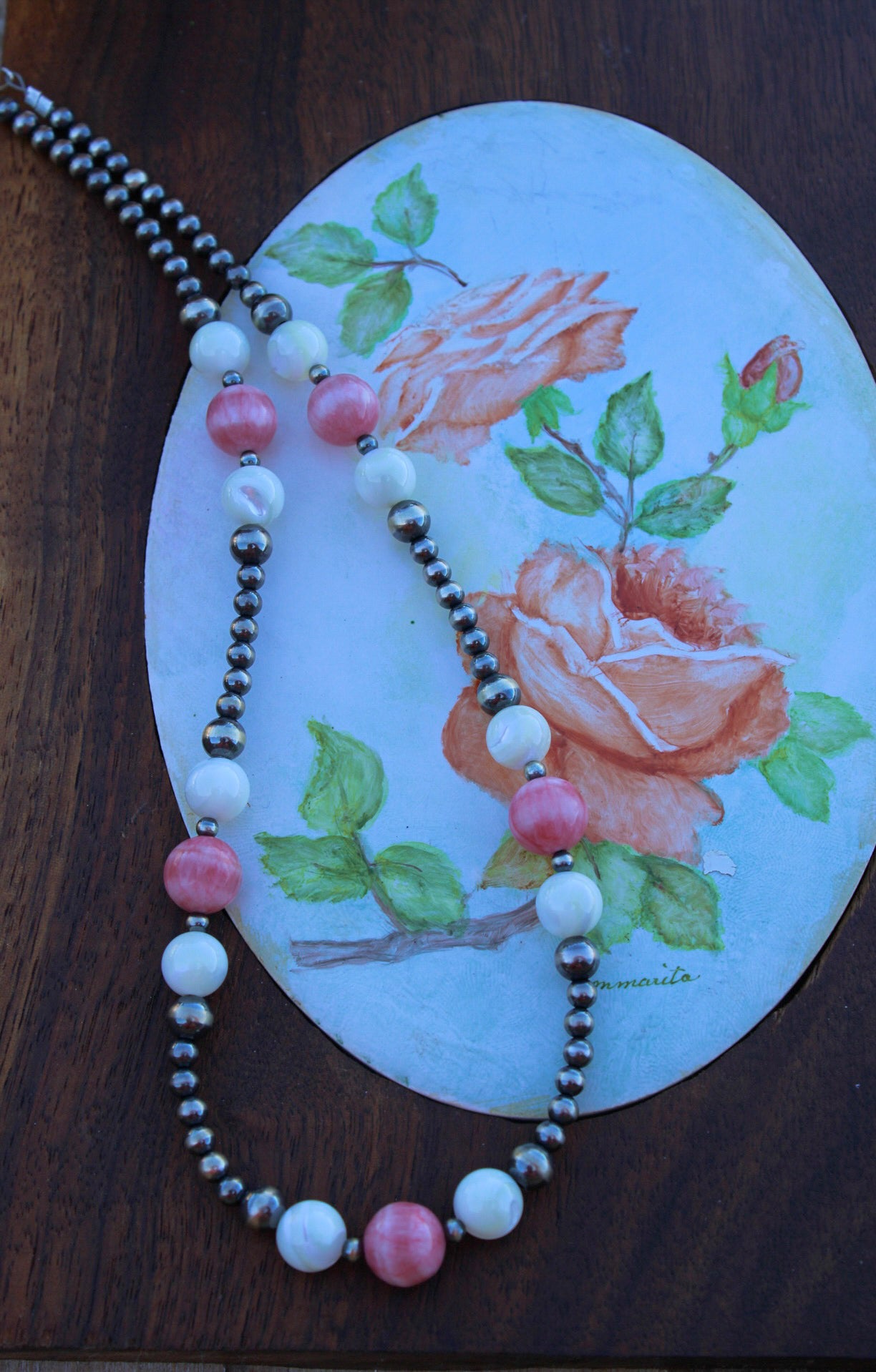 Features 3/4/6mm pears, 8mm mother of pearl, and rhodochrosite jade