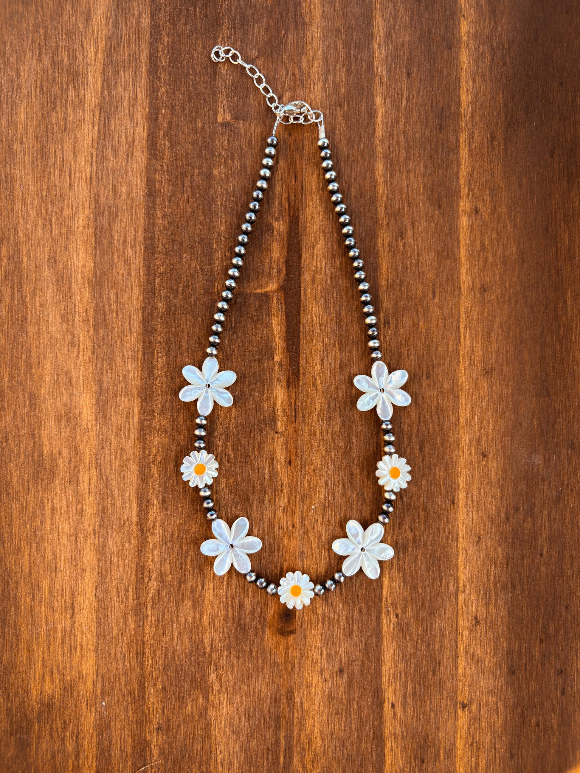 Features 4mm pearls and floral mother of pearl beads