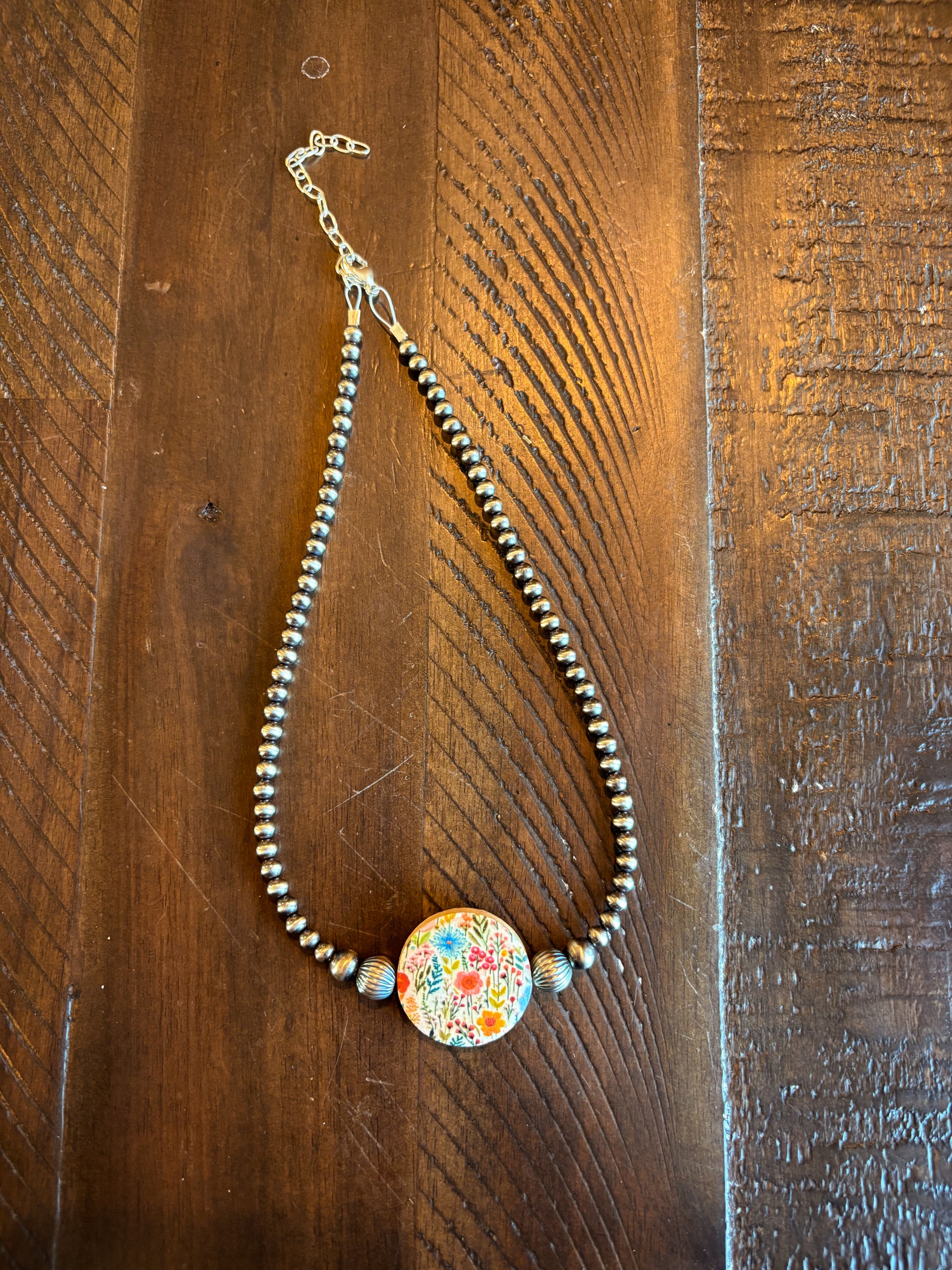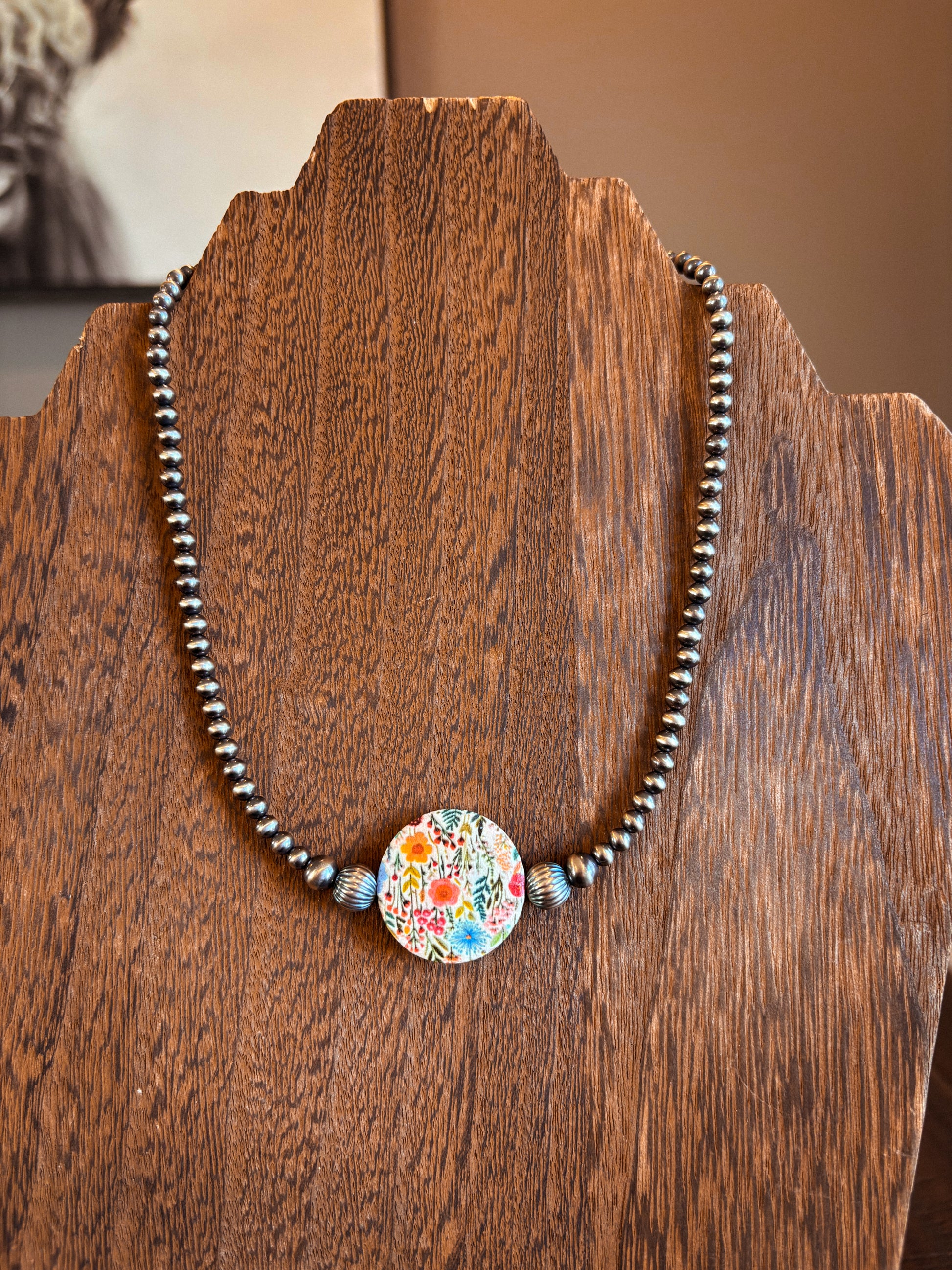 Features 4/6mm pearls, 8mm corrugated pearls, and a wood floral bead