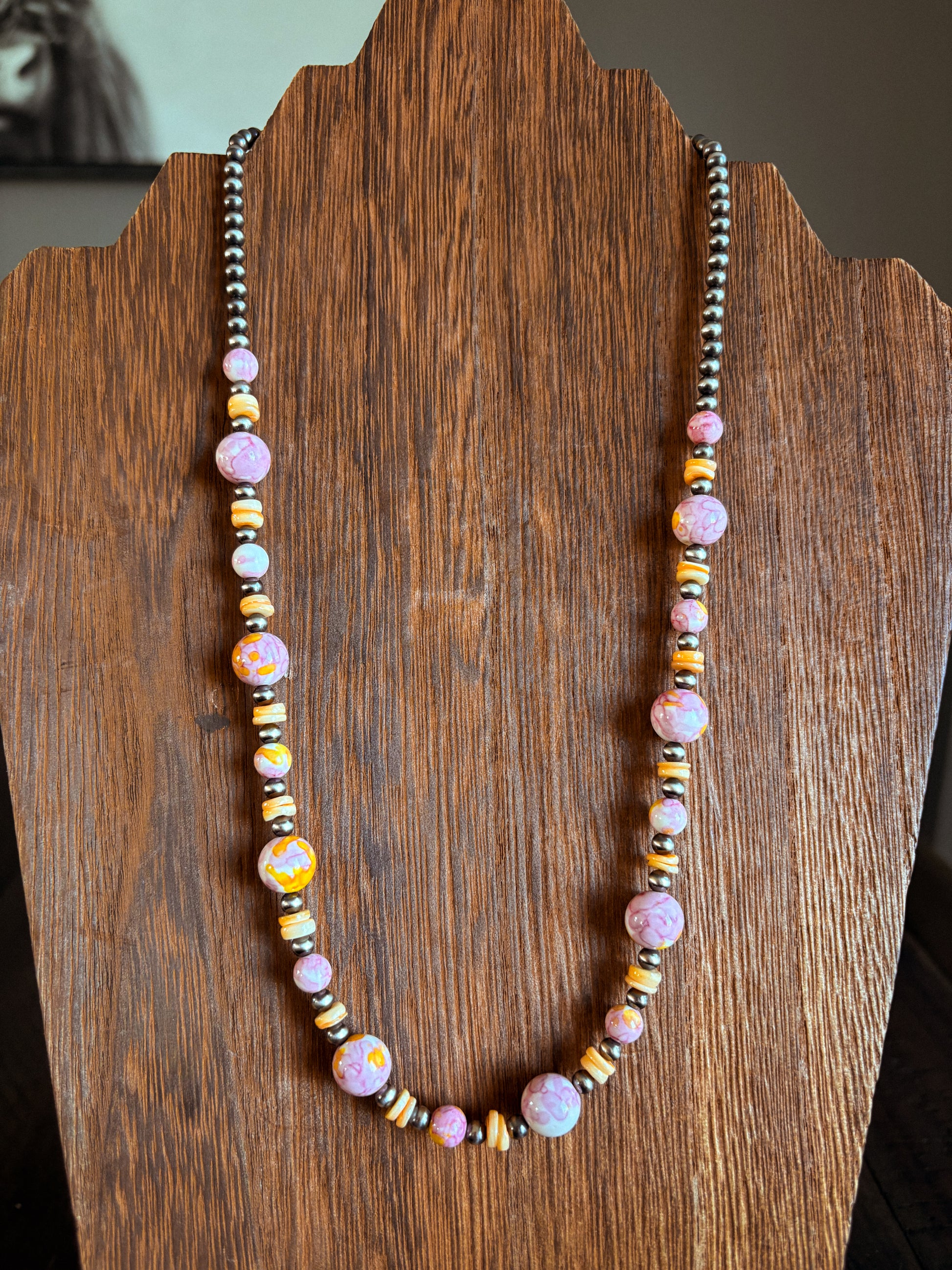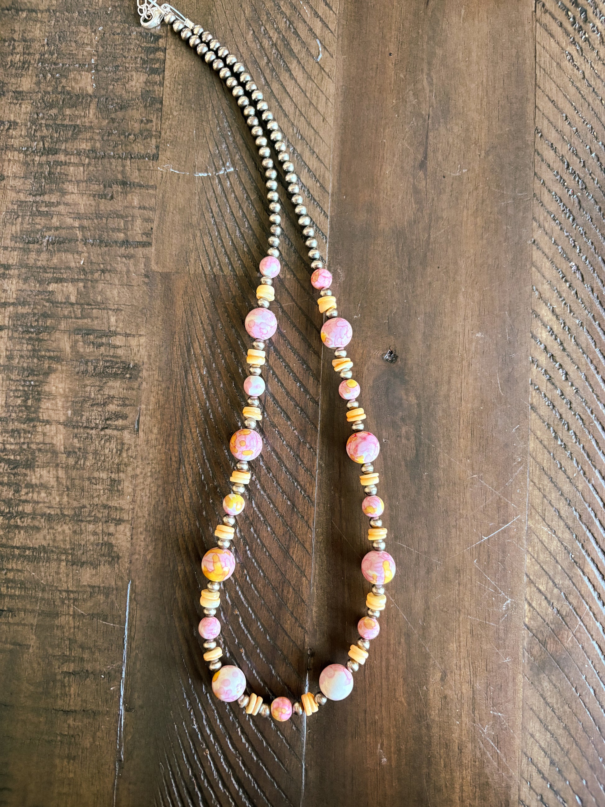 Features 4mm pearls, orange shell, and pink/orange rainflower beads