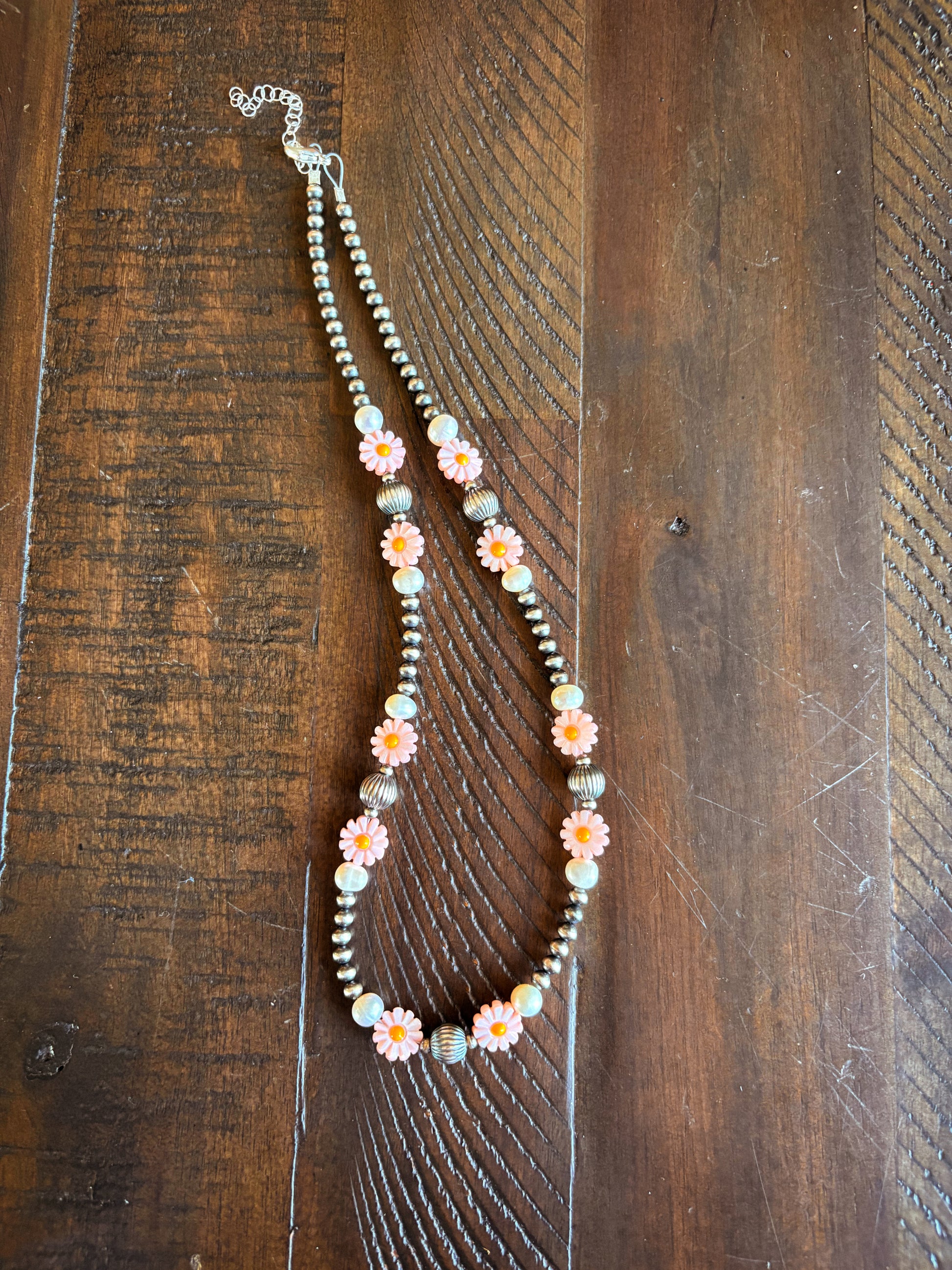 Features 3/4mm pearls, 8mm corrugated pearls, freshwater pearls, and pink daisy beads