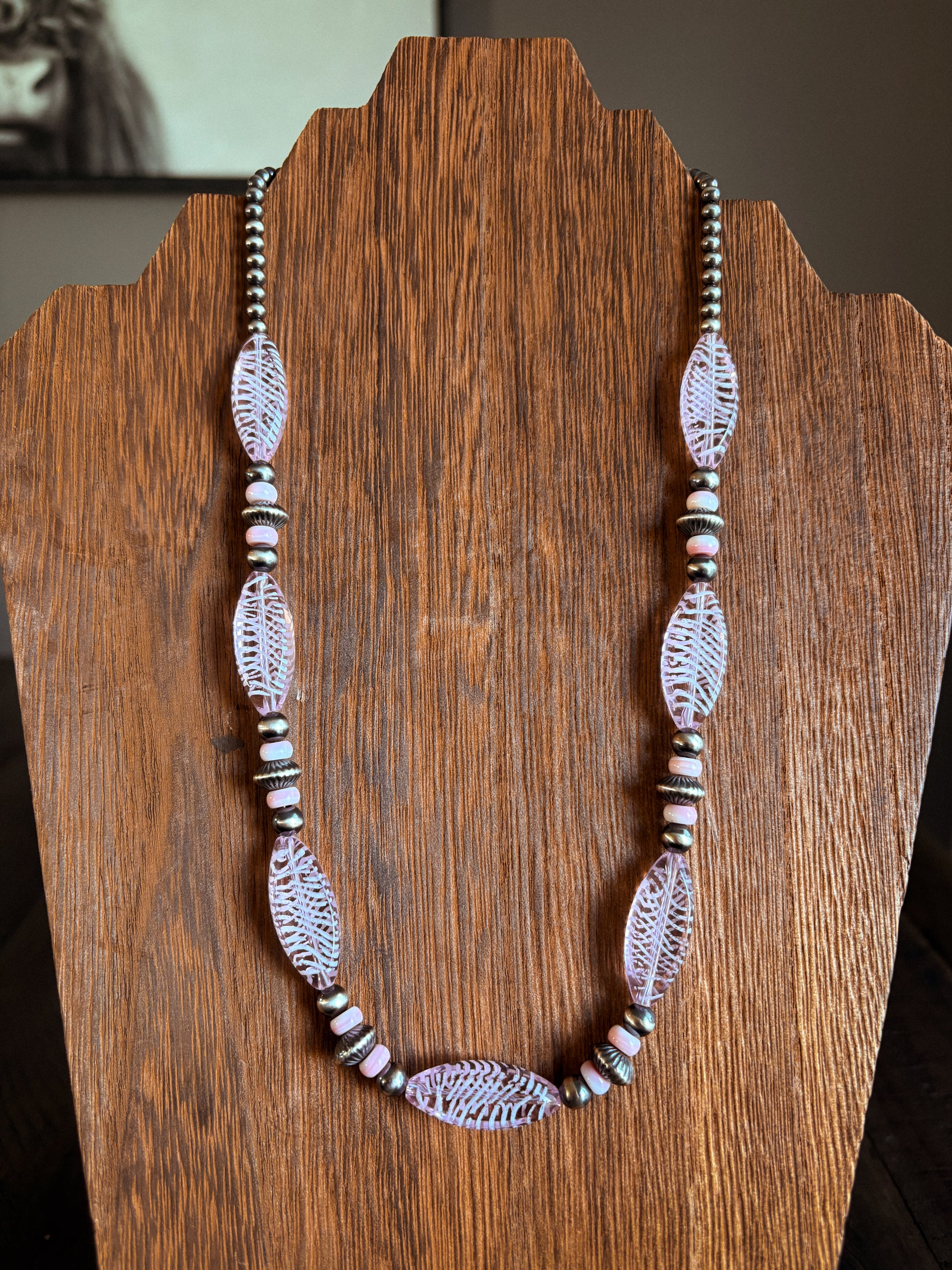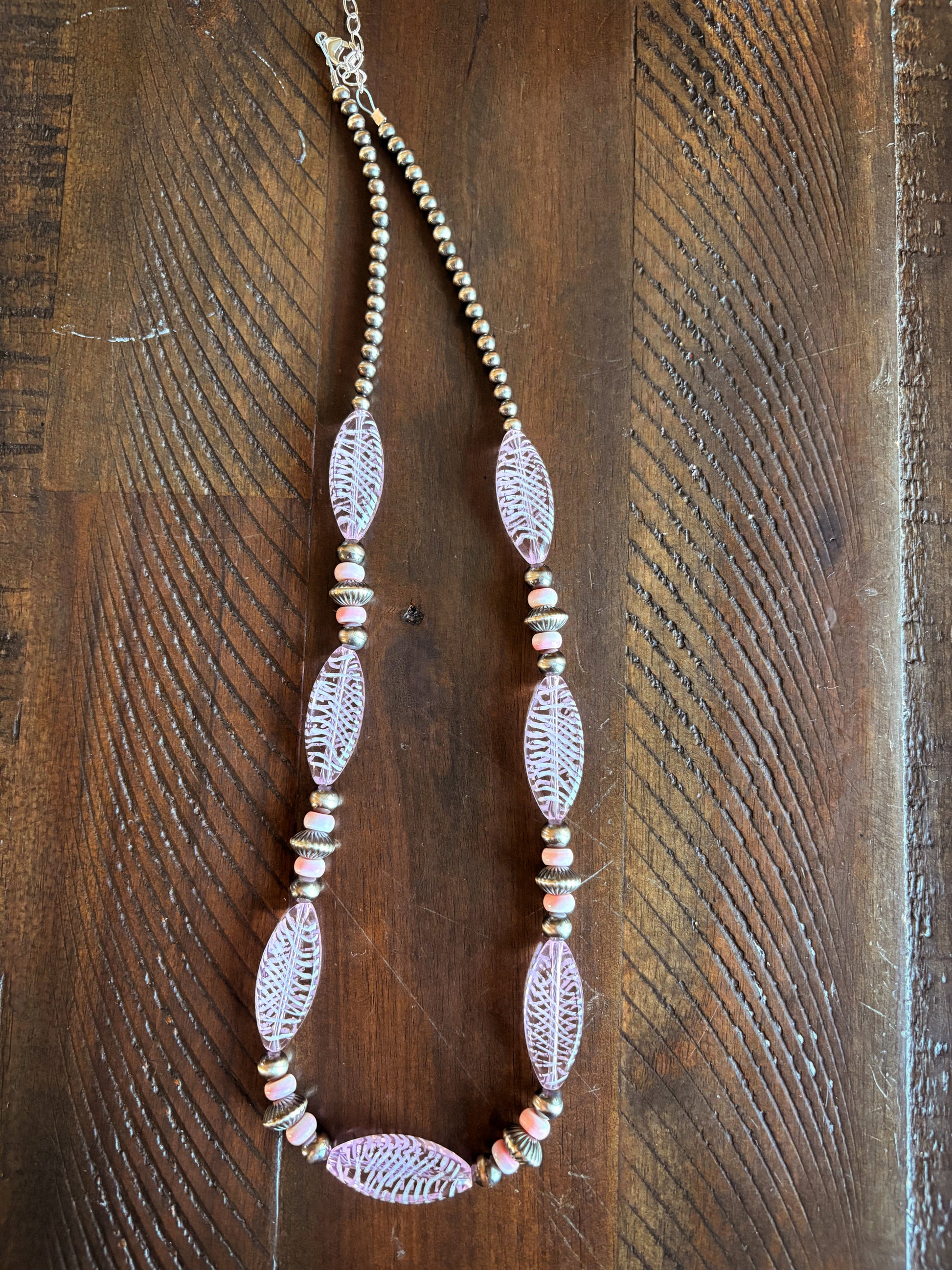 Features 4/6mm pearls, corrugated saucer pearls, pink conch, and pink crystal quartz