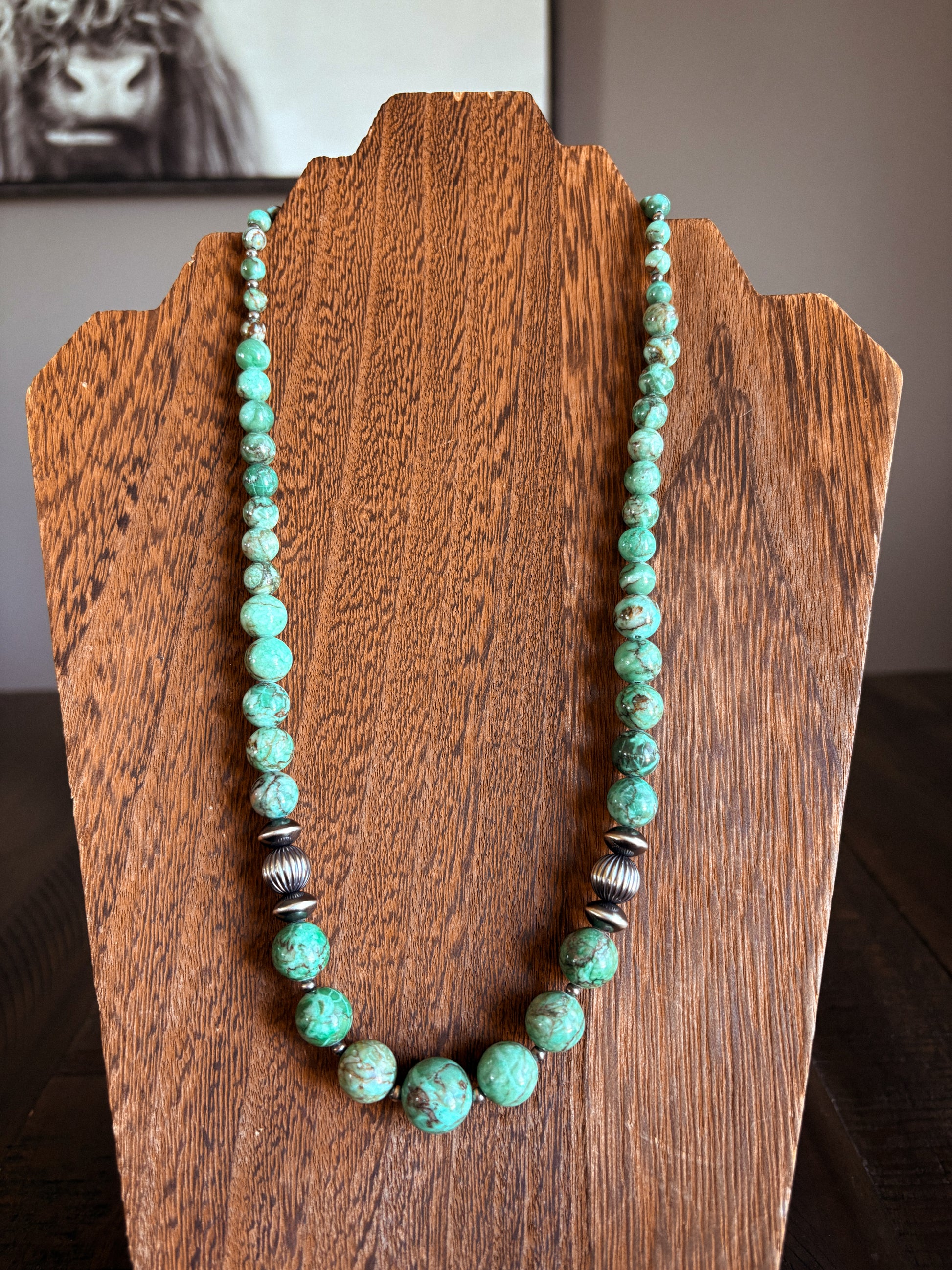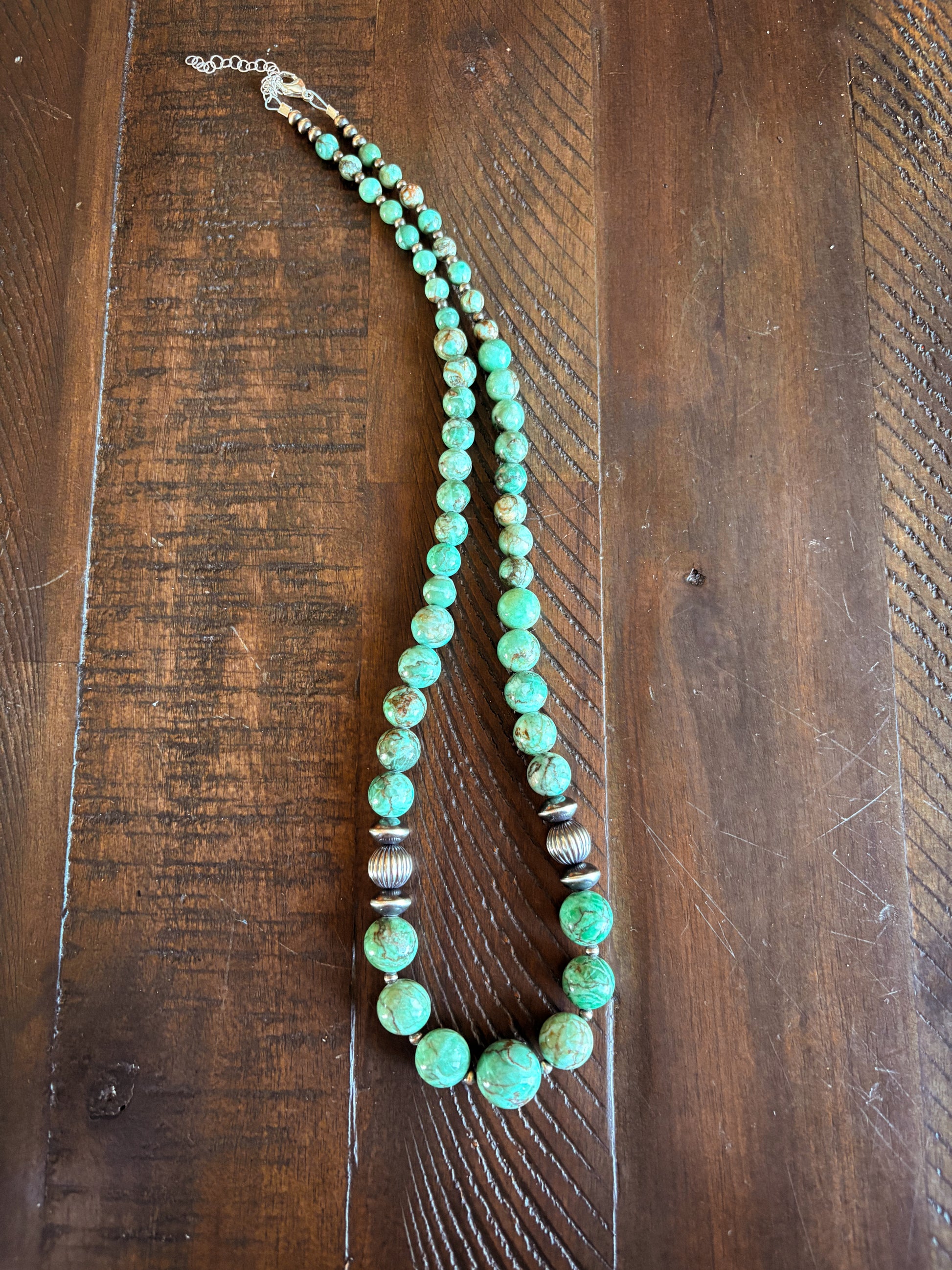 Features3/4mm pearls, 10mm corrugated pearls, saucer pearls, and graduated green chrysoprase