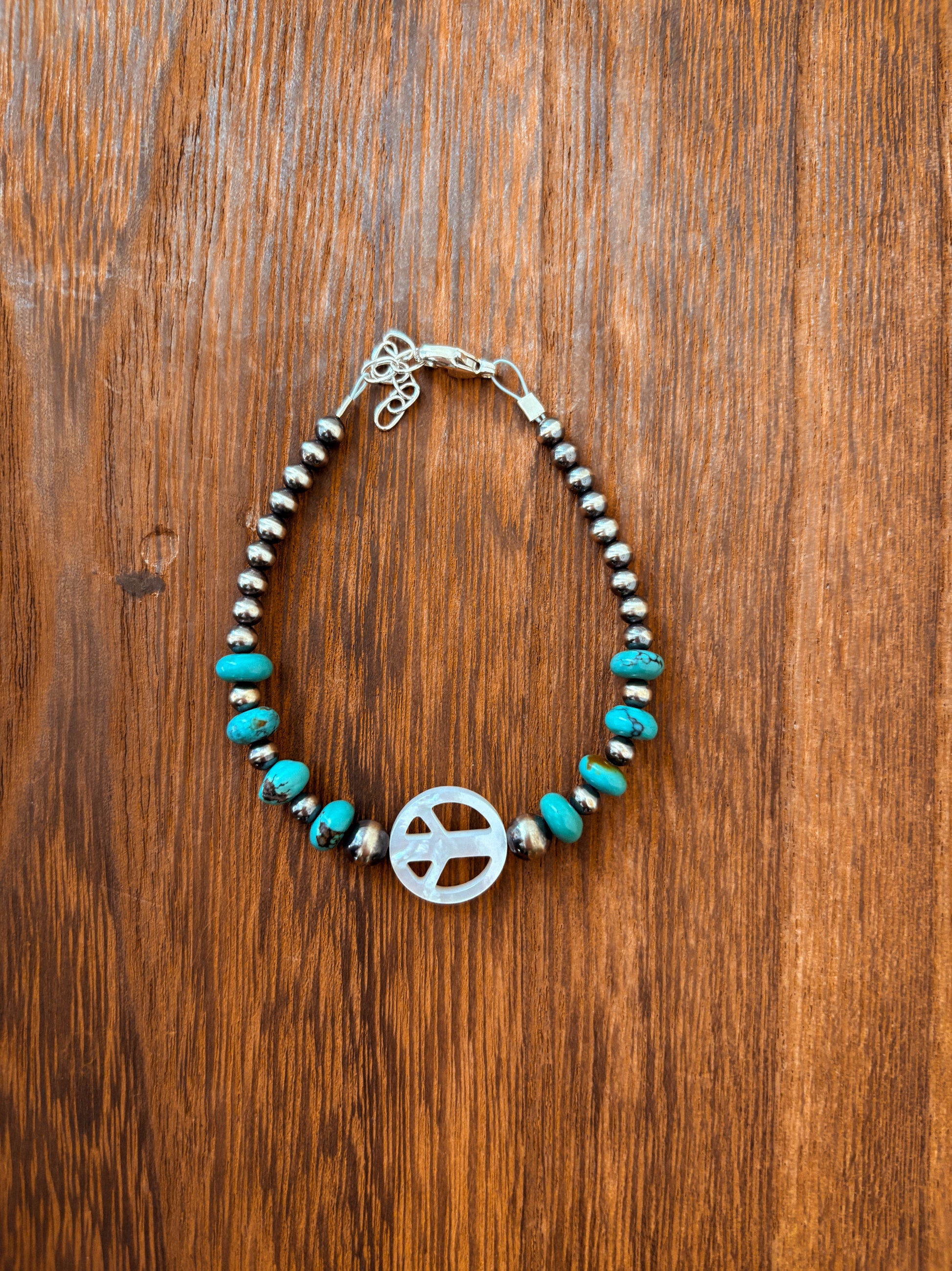 Features 4/6mm pearls, turquoise, and a mother-of-pearl peace sign