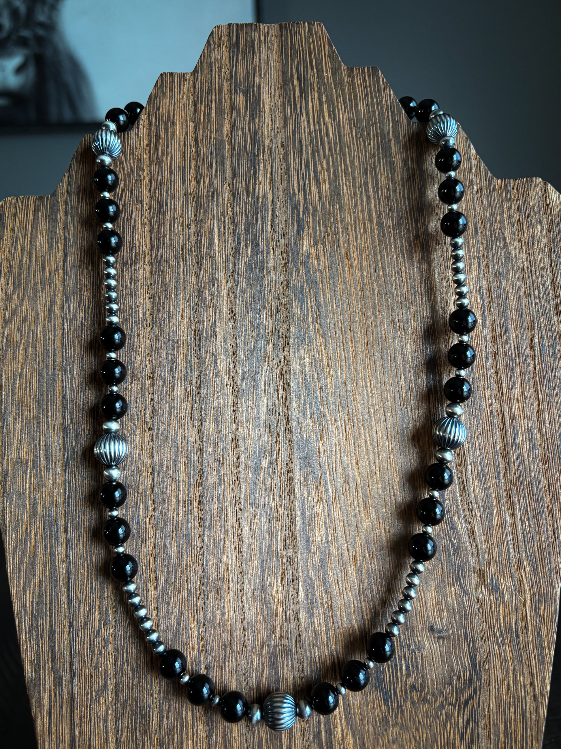 Features 3-5mm pearls, 10mm corrugated pearls and 8mm black onyx