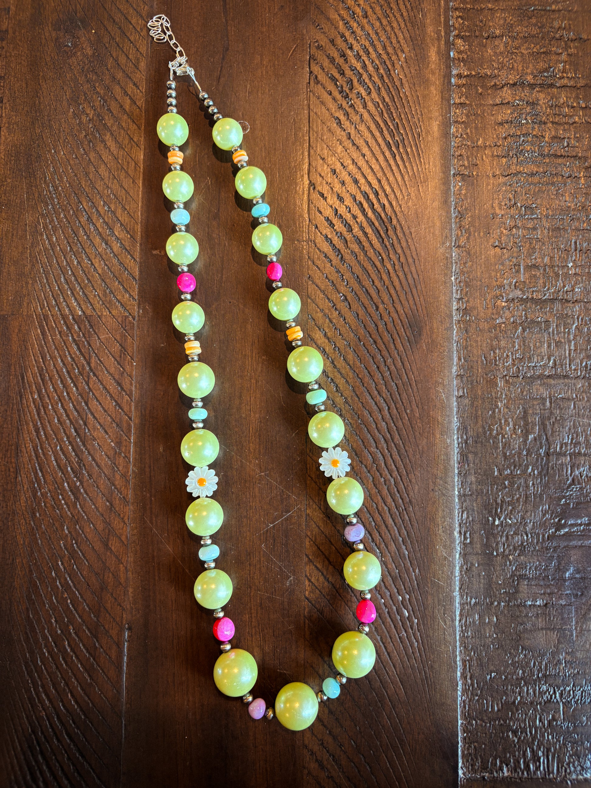 Features 4mm pearls, orange shell, blue/pink/green/purple opal, floral beads, and graduated green jade