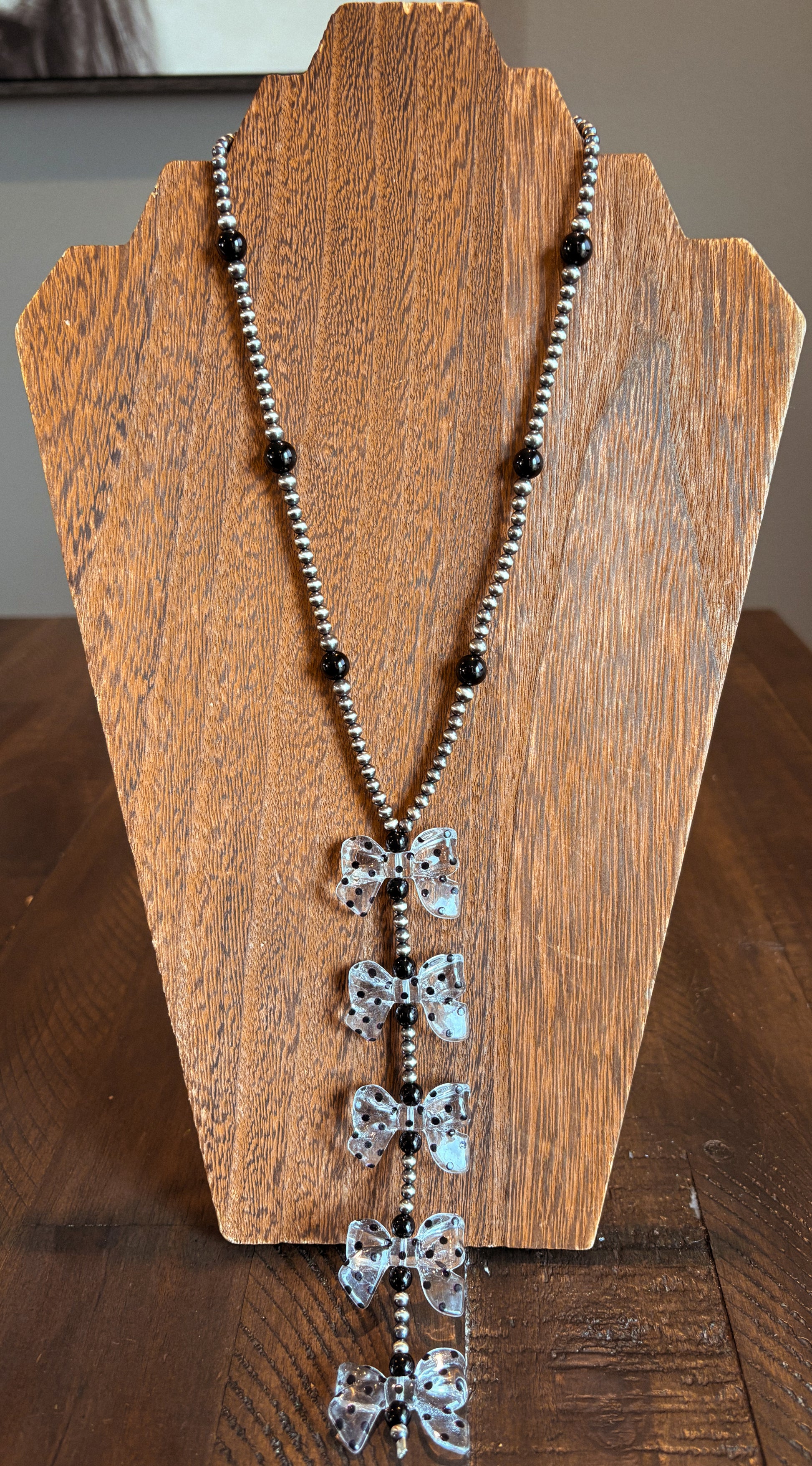 Features 4/5mm pearls, 6/8mm black onyx, and resin bows