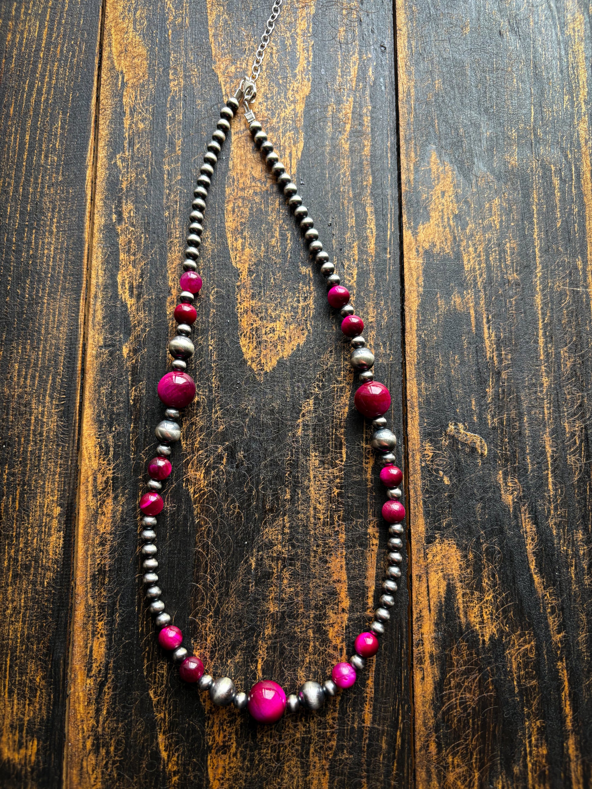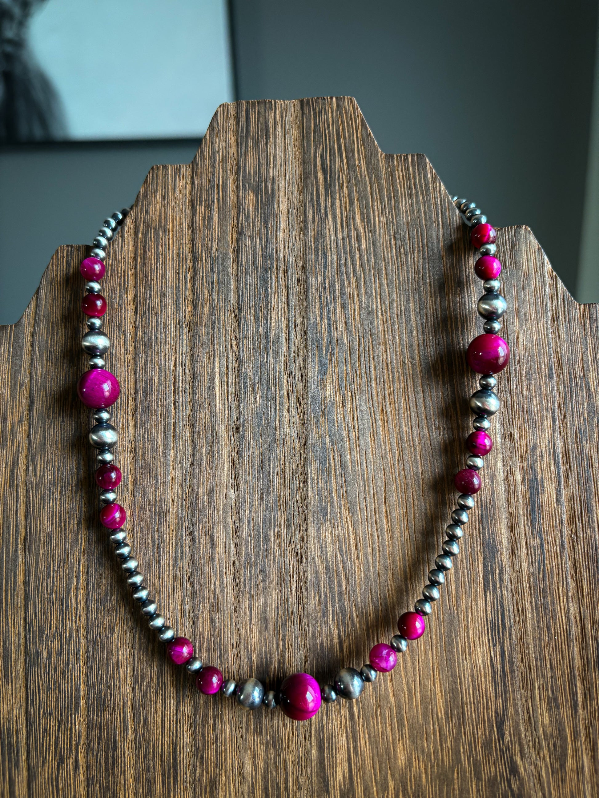 Features 4/7mm pearls and 6/10mm pink-purple tigers eye