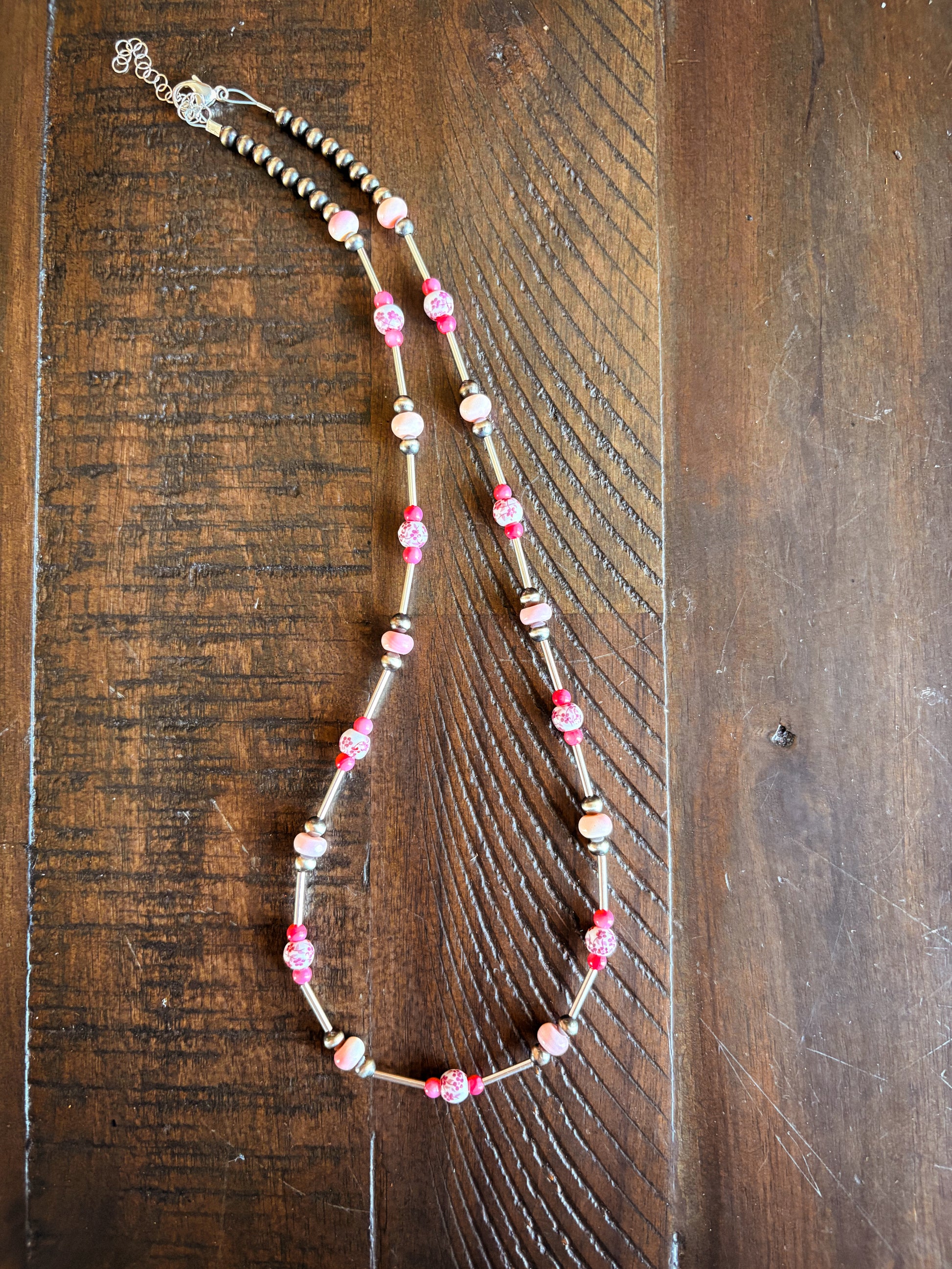 Features 4mm pearls, sterling liquid silver, pink conch, pink floral beads, and pink jade